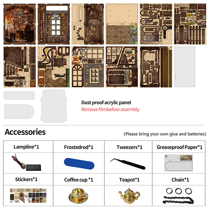 Every kit contains pre-cut precision wooden pieces, pre-painted details for authentic textures, illustrated step-by-step instructions, LED lighting components (where applicable), and all specialty materials needed to bring your miniature world to life. Due to international shipping regulations, glue and batteries are excluded - but we'll guide you to the perfect adhesive solution!