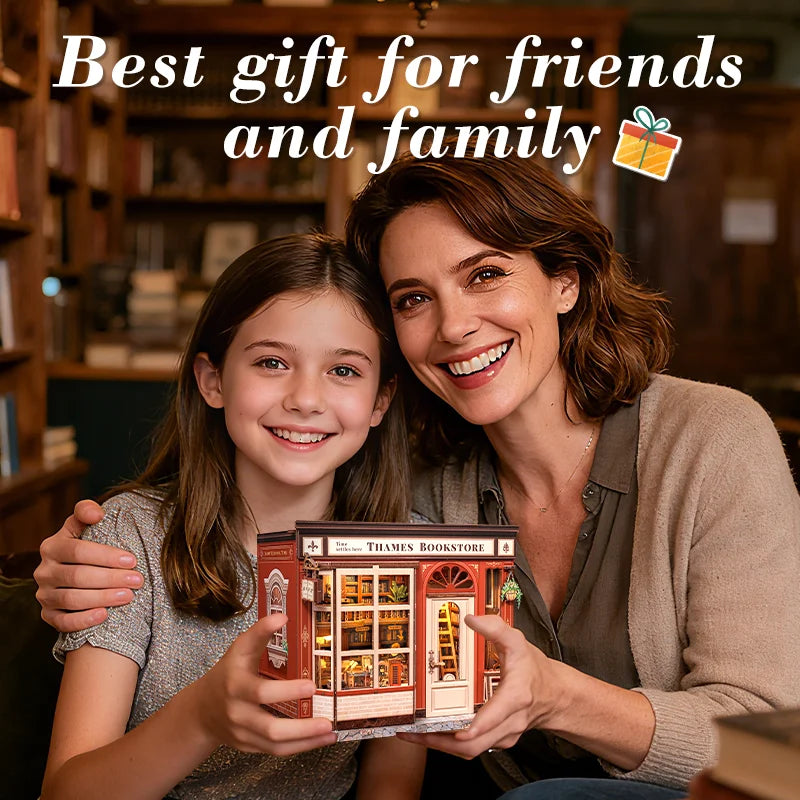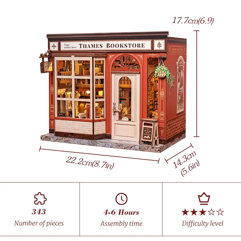 The Thames Bookstore DIY miniature kit recreates a charming old-world bookshop tucked along a quiet riverside lane. Deep red wooden frames, warm window lighting, stacked novels and handwritten signs come together to form a cozy storefront that feels like a place where stories linger in the air.